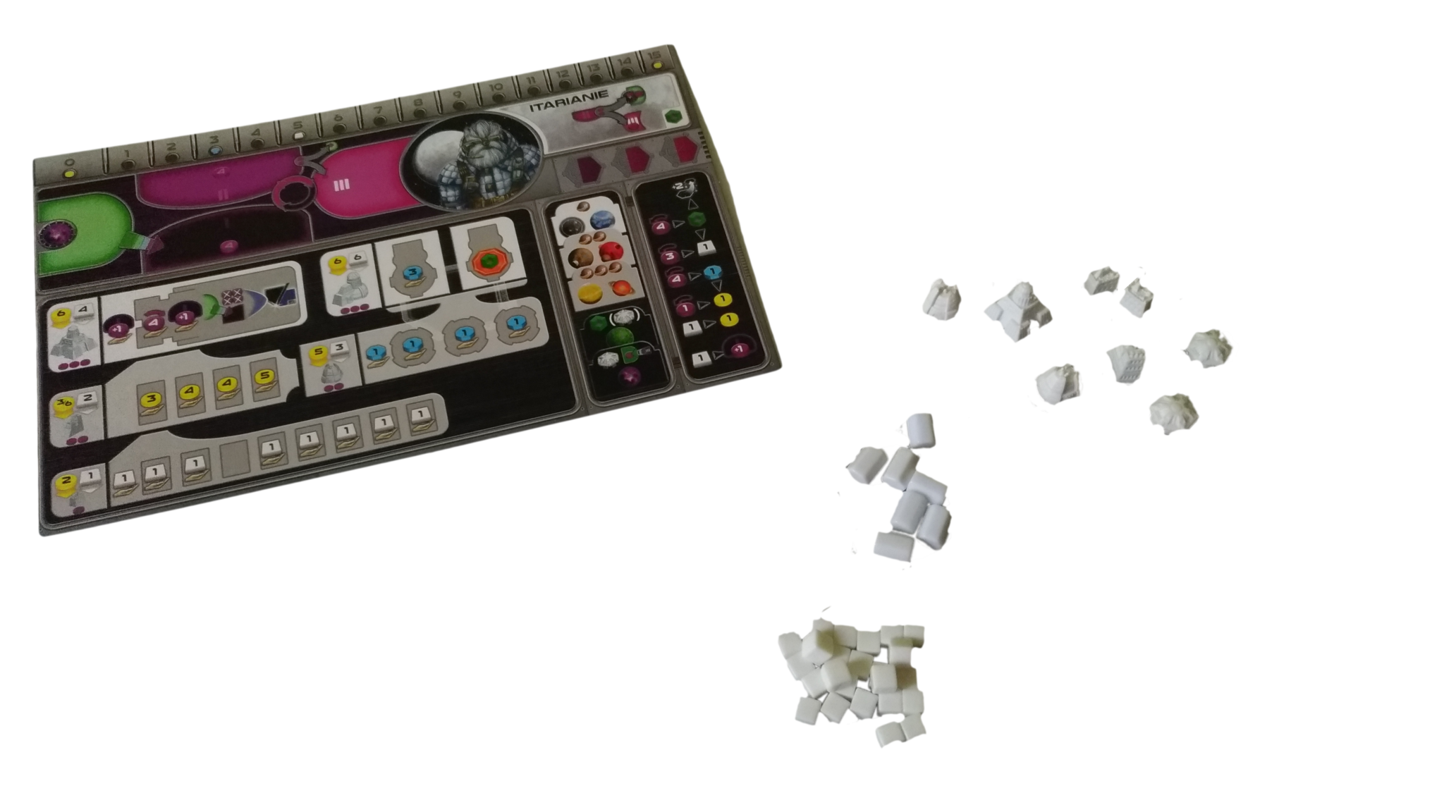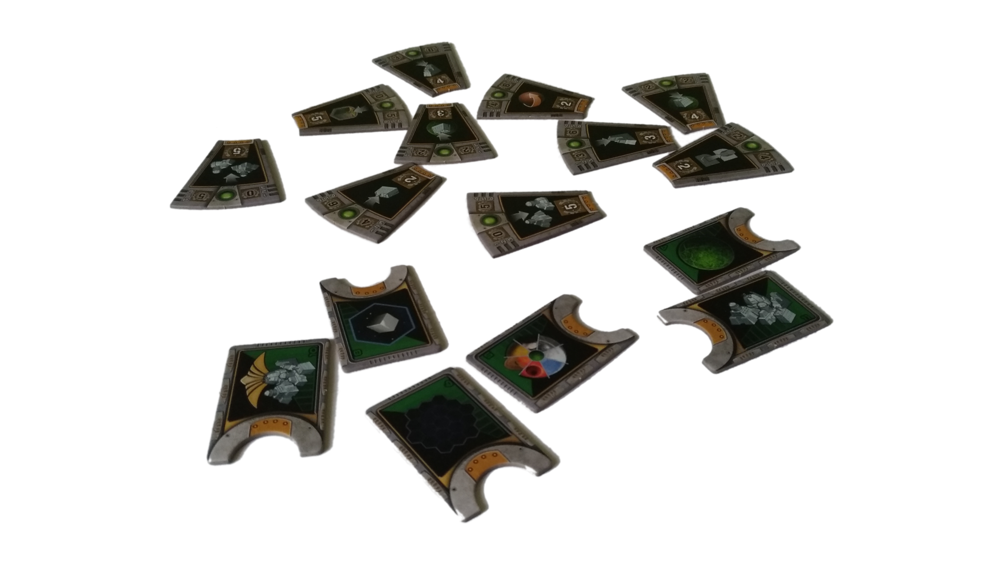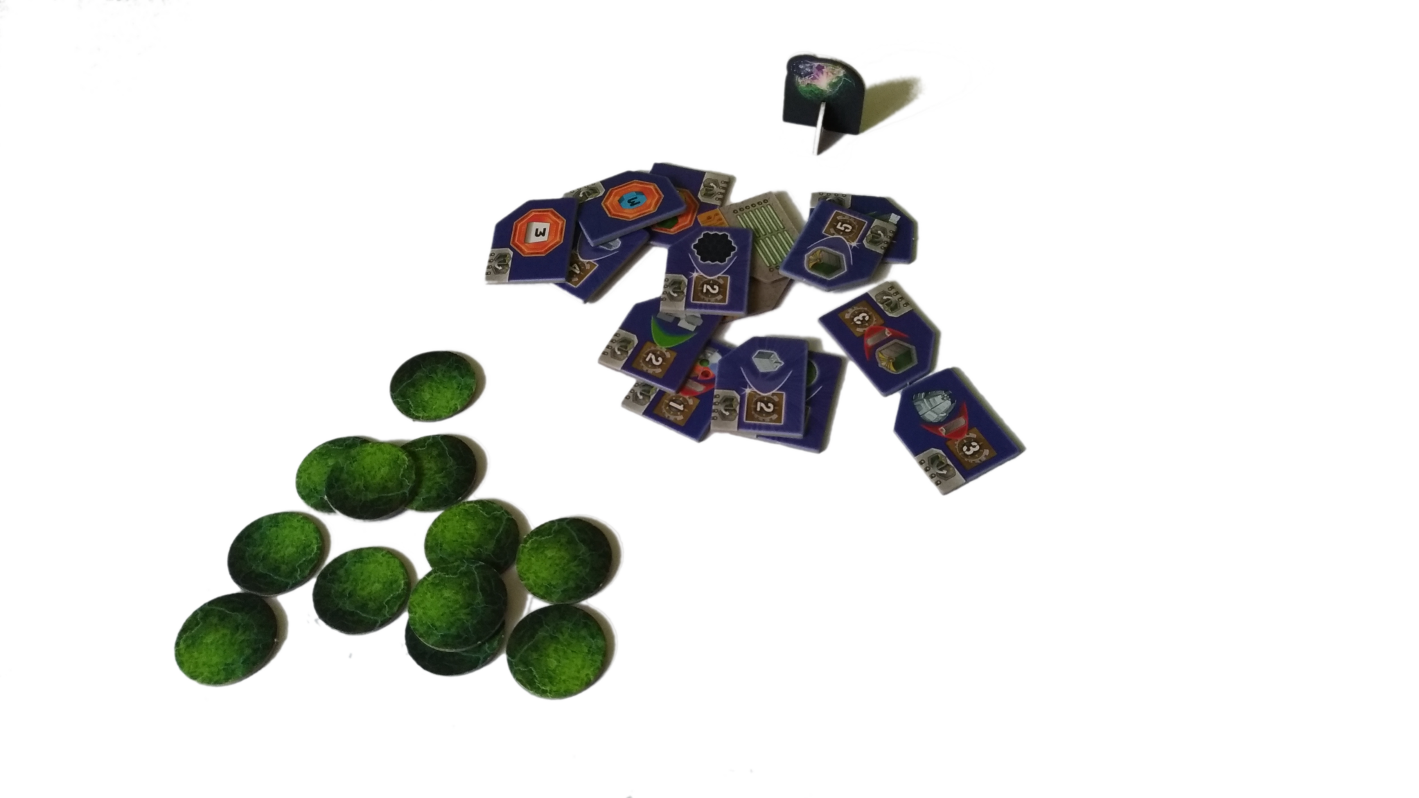 - do rozdzielenia pomiędzy 7 kolorów graczy: 14 znaczników kredytów, 7 znaczników rudy, 7 znaczników wiedzy, 30 KIK-ów, 50 znaczników mocy, 1 Kamień Umysłu (dla frakcji Taklonów)