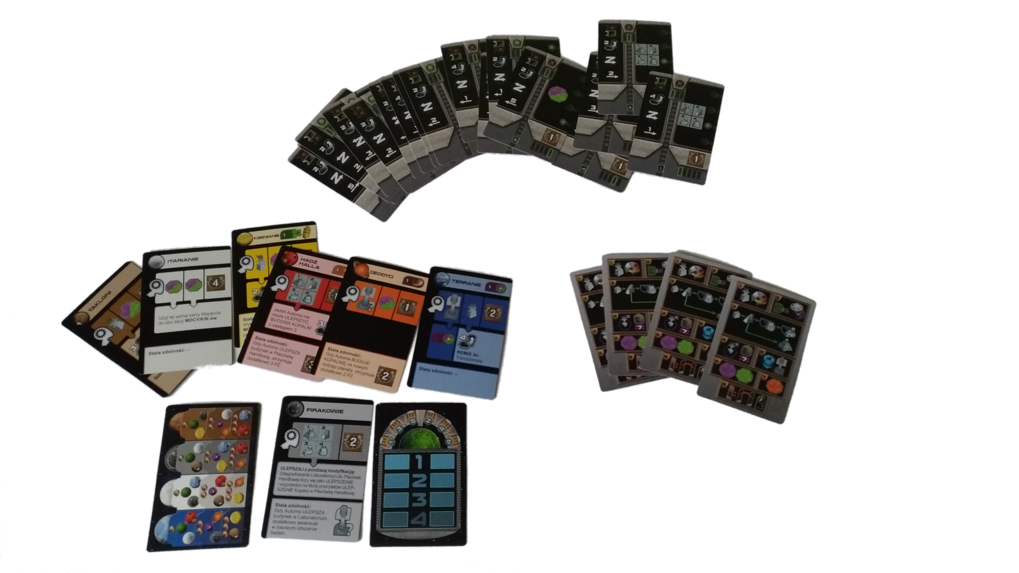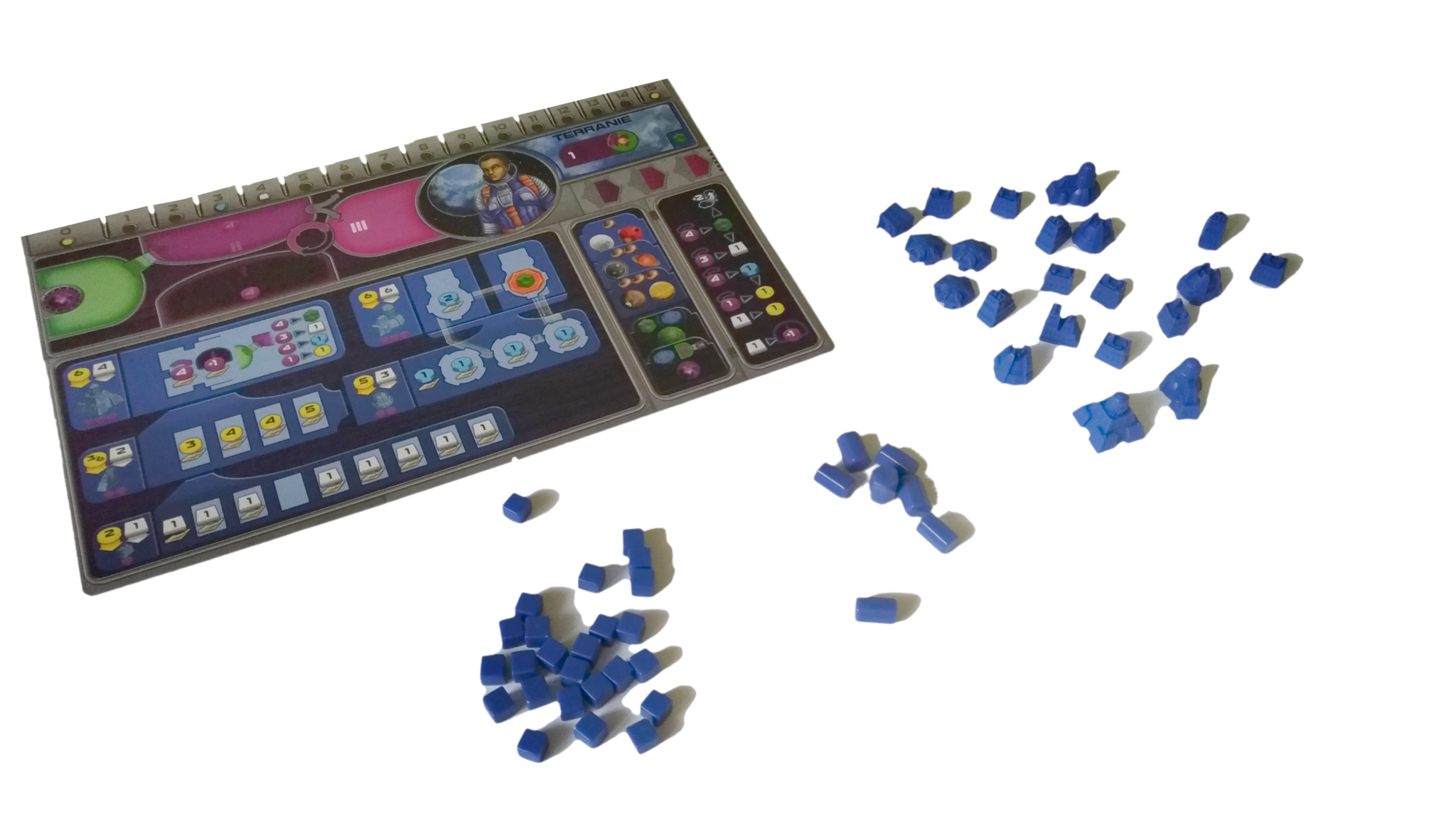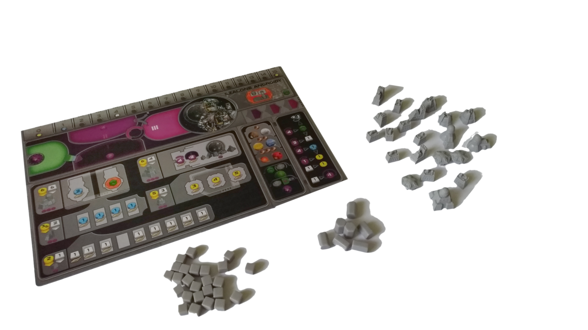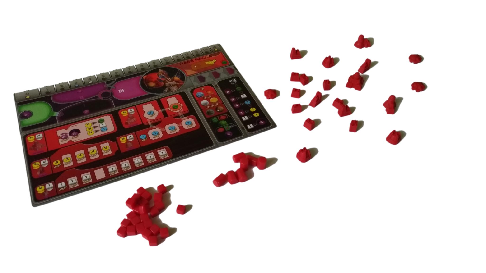 - do rozdzielenia pomiędzy 7 kolorów graczy: 14 znaczników kredytów, 7 znaczników rudy, 7 znaczników wiedzy, 30 KIK-ów, 50 znaczników mocy, 1 Kamień Umysłu (dla frakcji Taklonów)