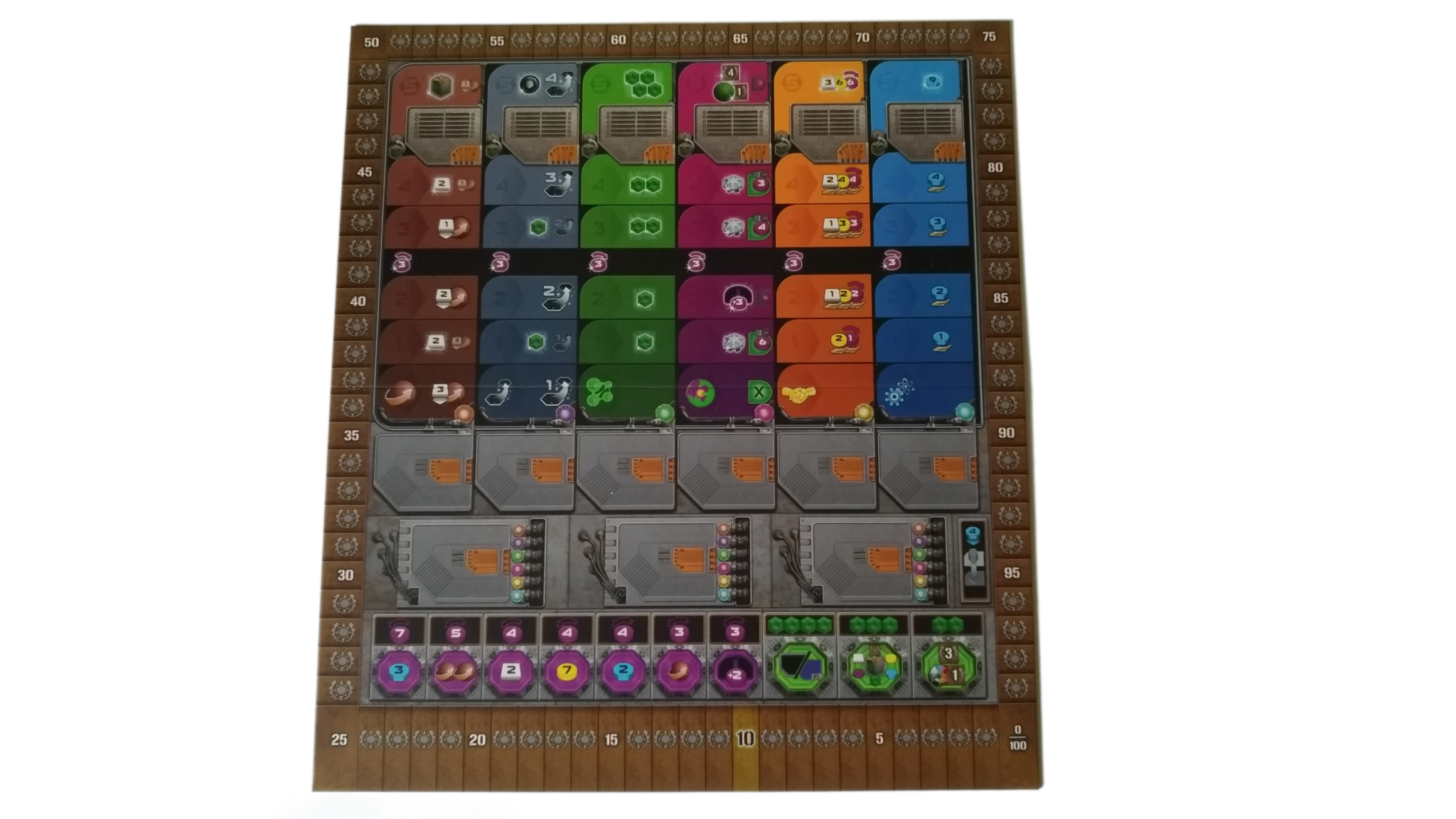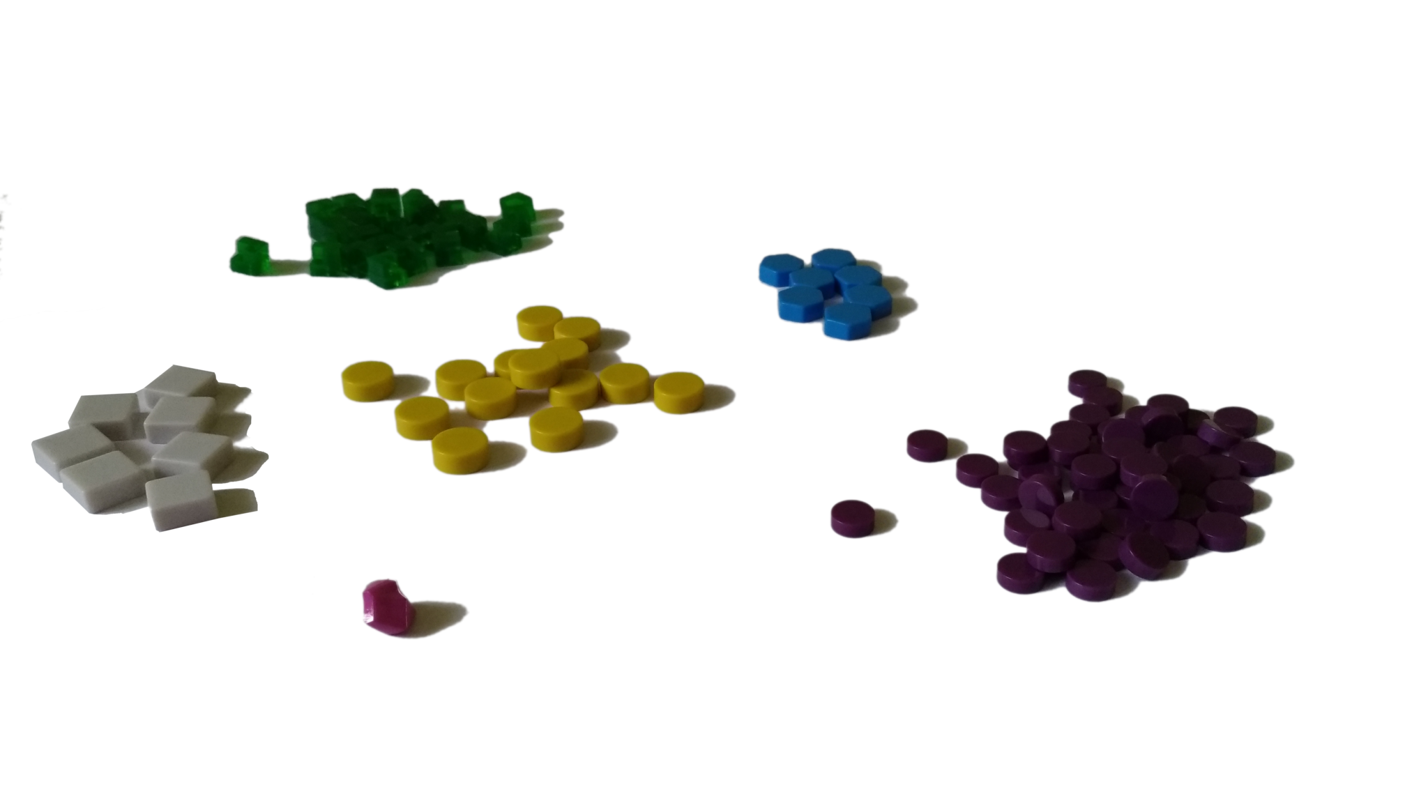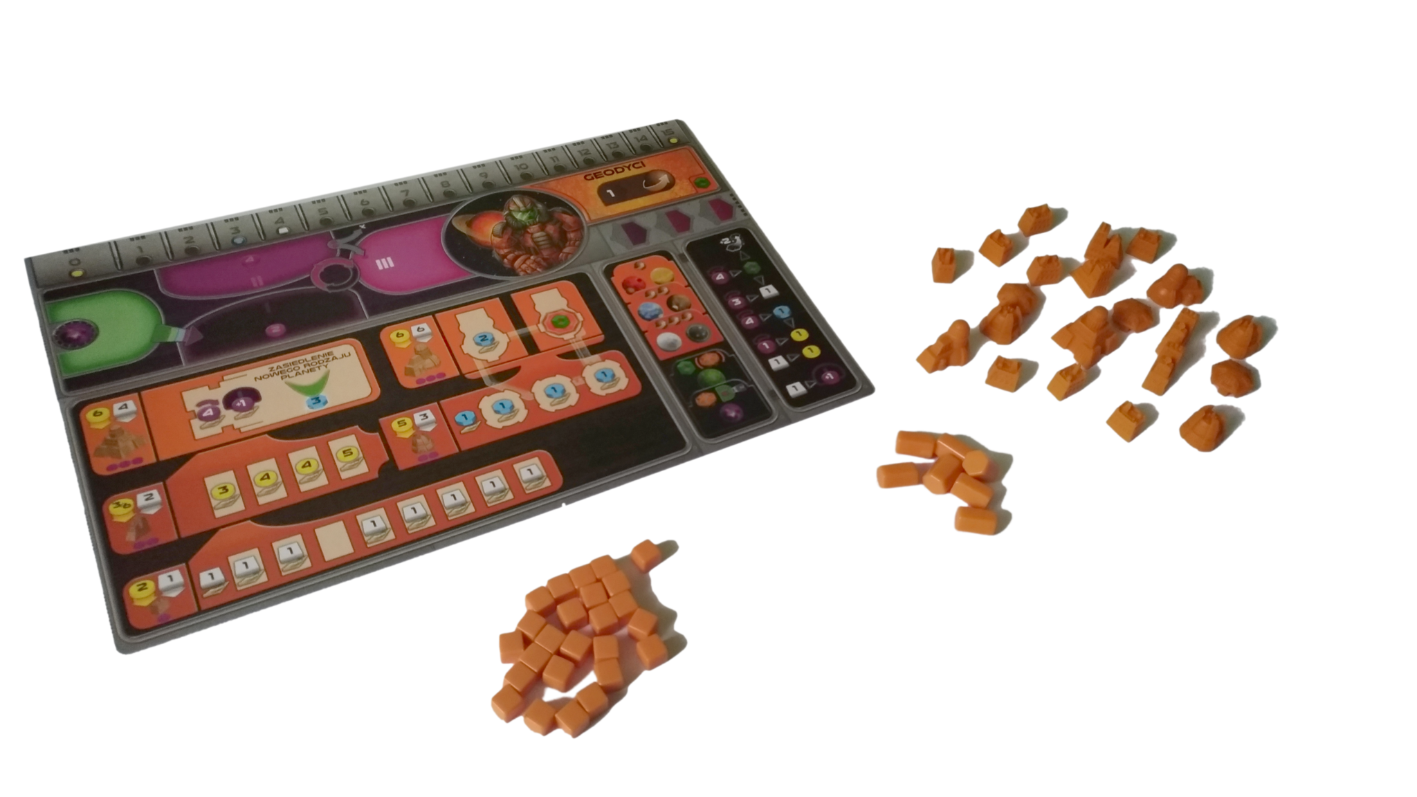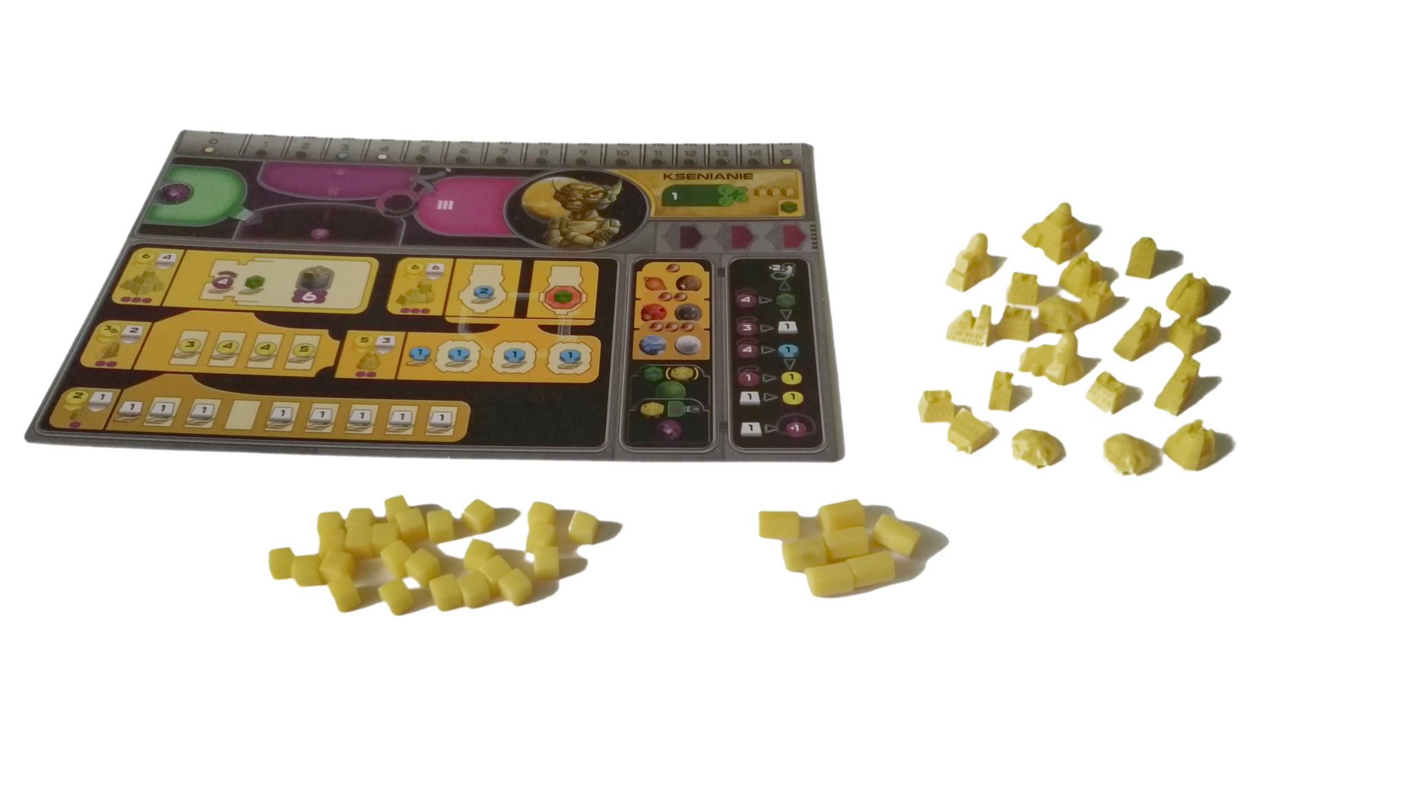 - budynki w każdym z siedmiu kolorów (żółtym, pomarańczowym, brązowym, białym, szarym, niebieskim oraz czerwonym): 8 kopalni, 4 placówki handlowe, 3 laboratoria, 2 akademie, 1 instytut planetarny, 3 gajaformery, 7 znaczników gracza, 25 satelitów