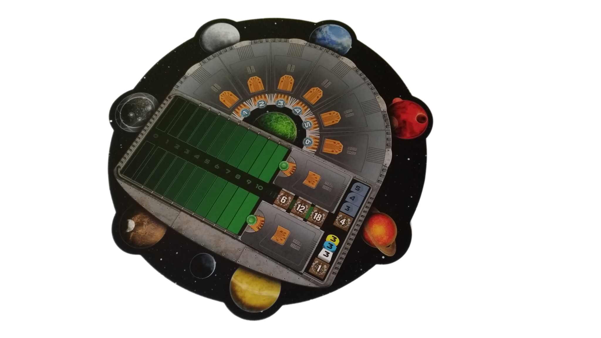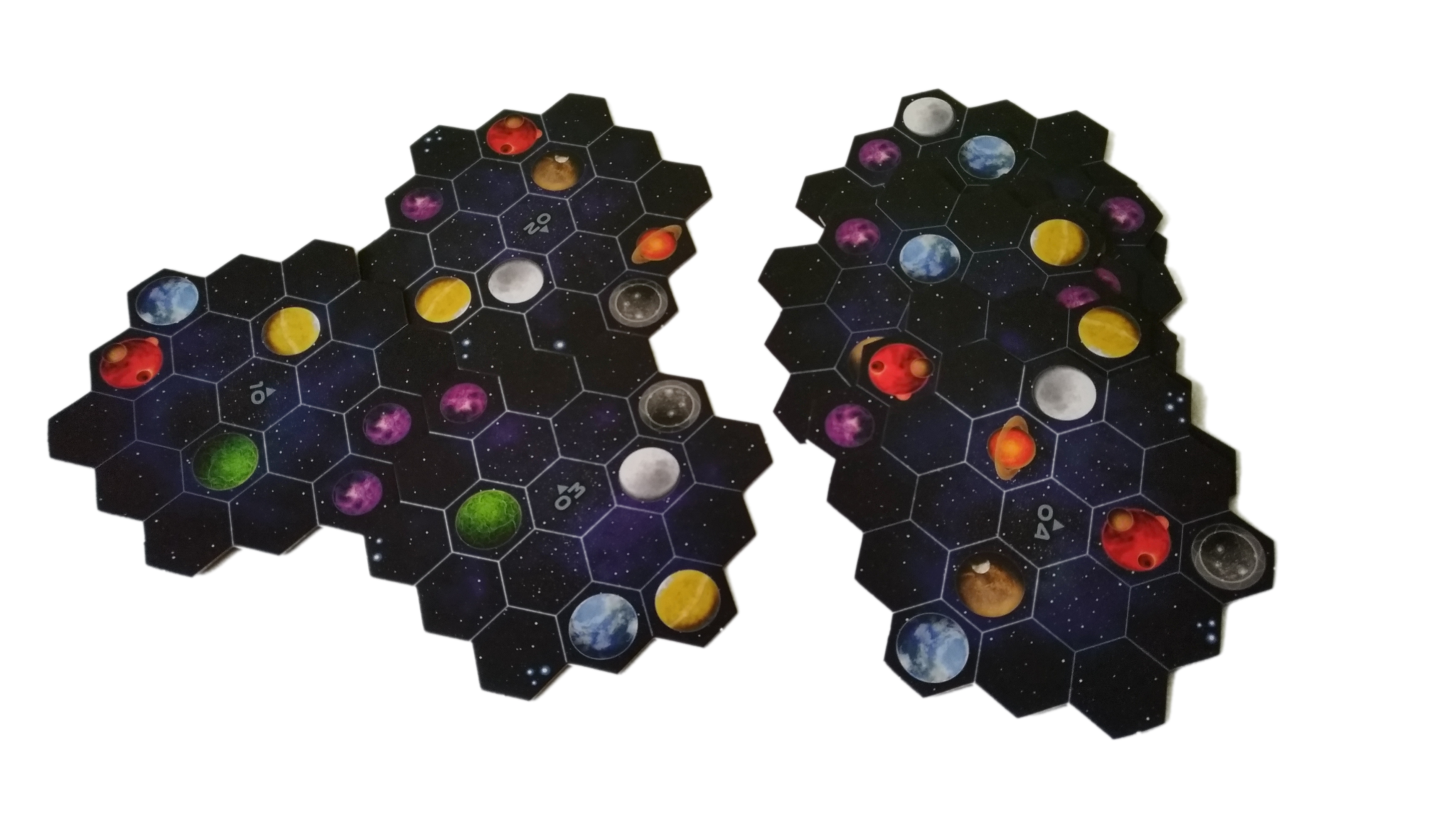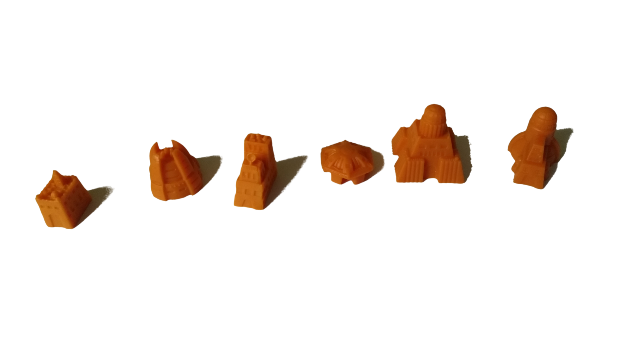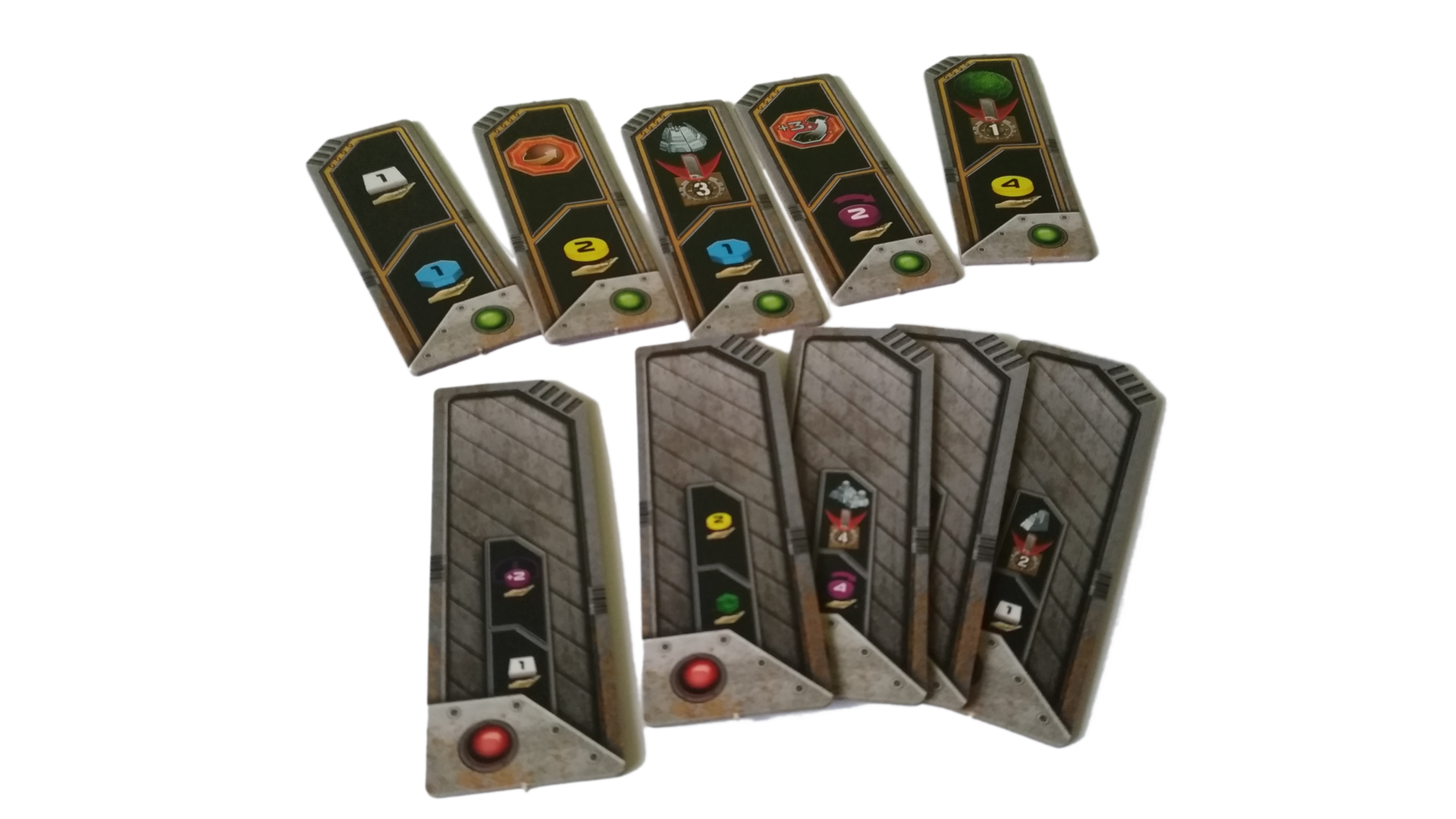 - budynki w każdym z siedmiu kolorów (żółtym, pomarańczowym, brązowym, białym, szarym, niebieskim oraz czerwonym): 8 kopalni, 4 placówki handlowe, 3 laboratoria, 2 akademie, 1 instytut planetarny, 3 gajaformery, 7 znaczników gracza, 25 satelitów